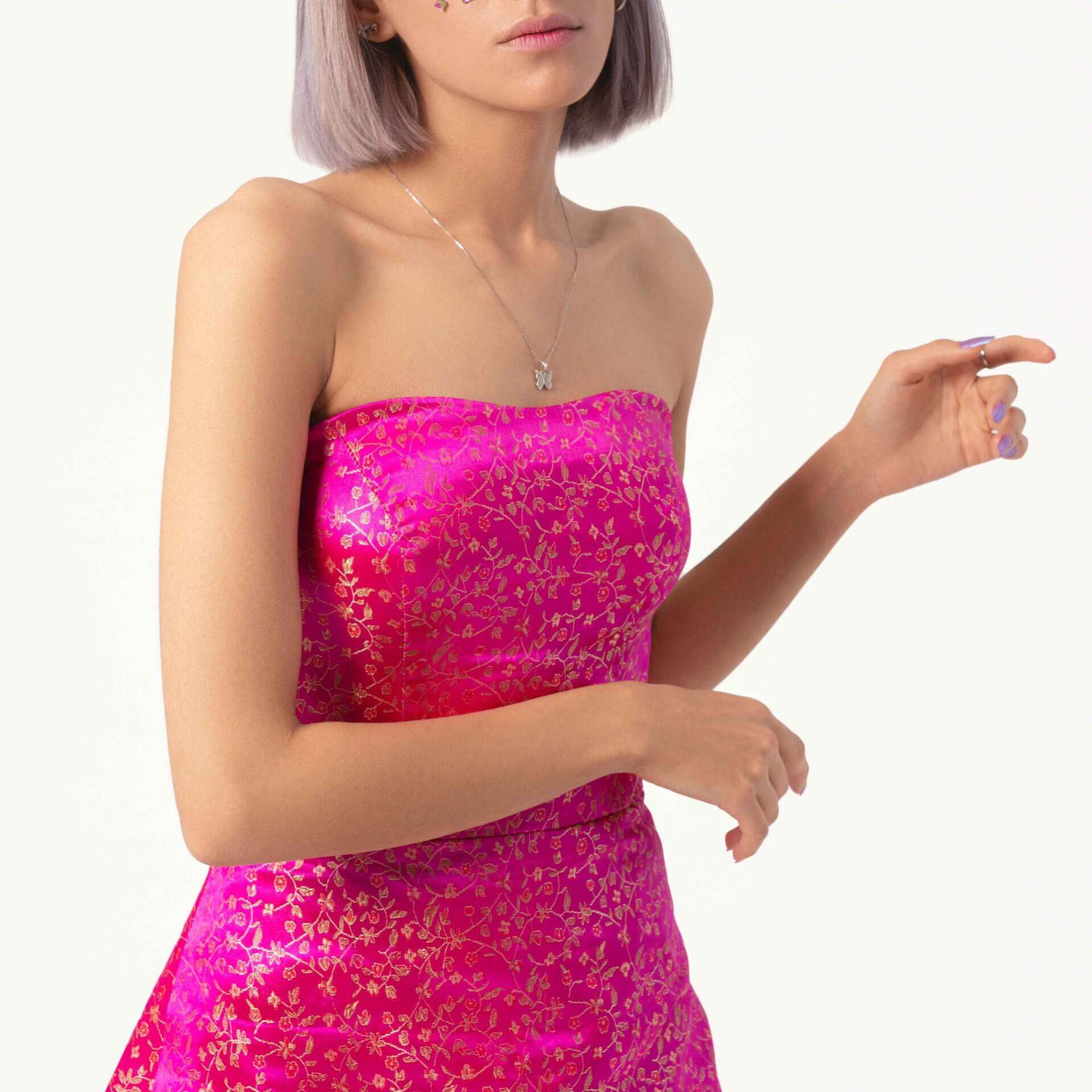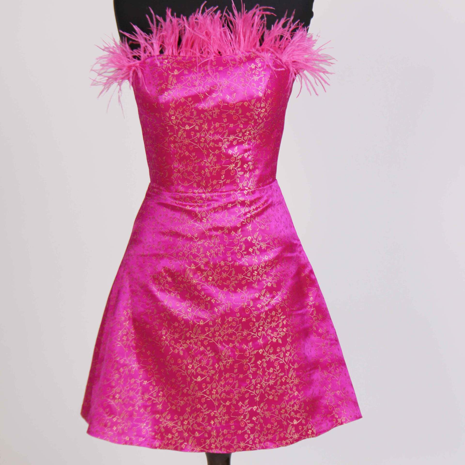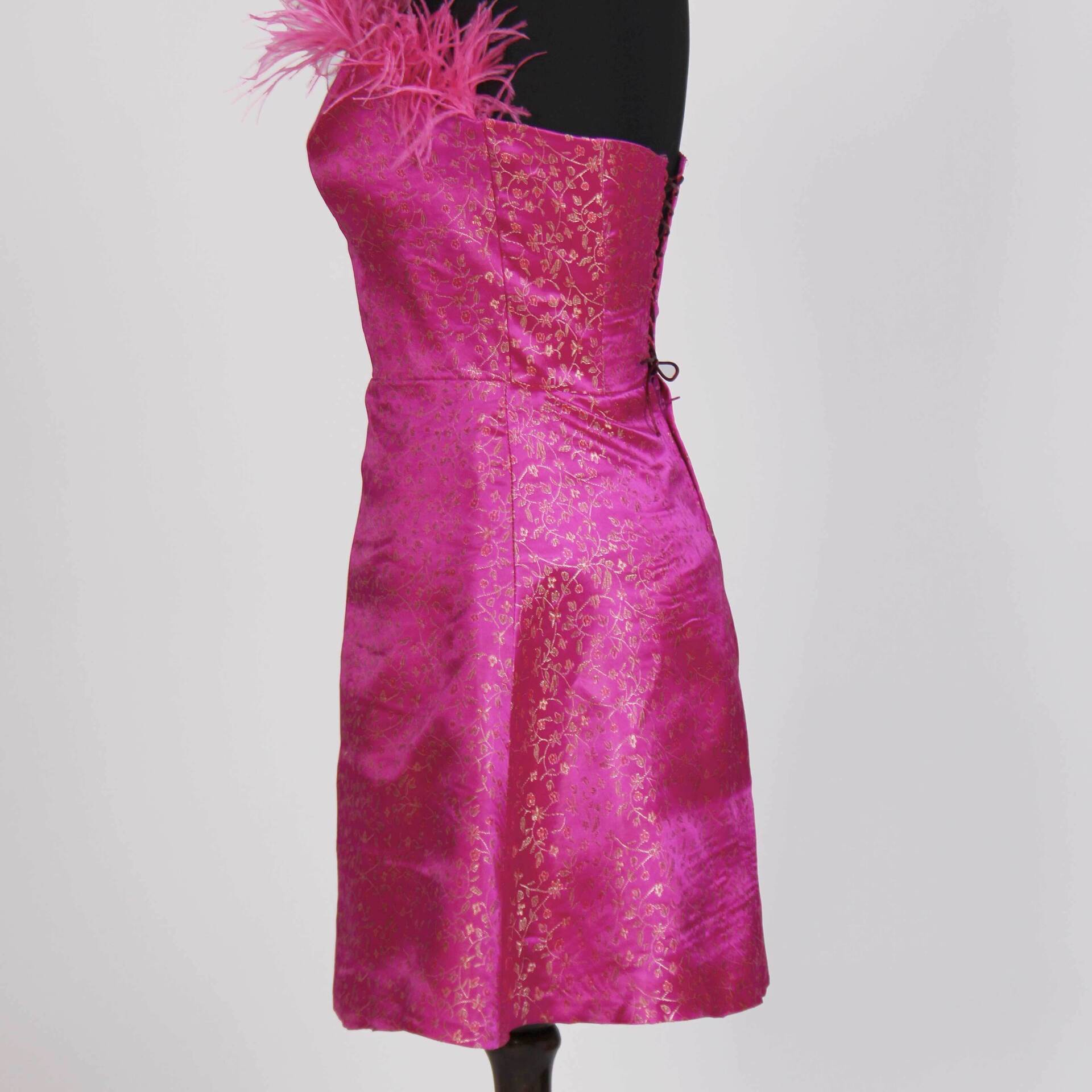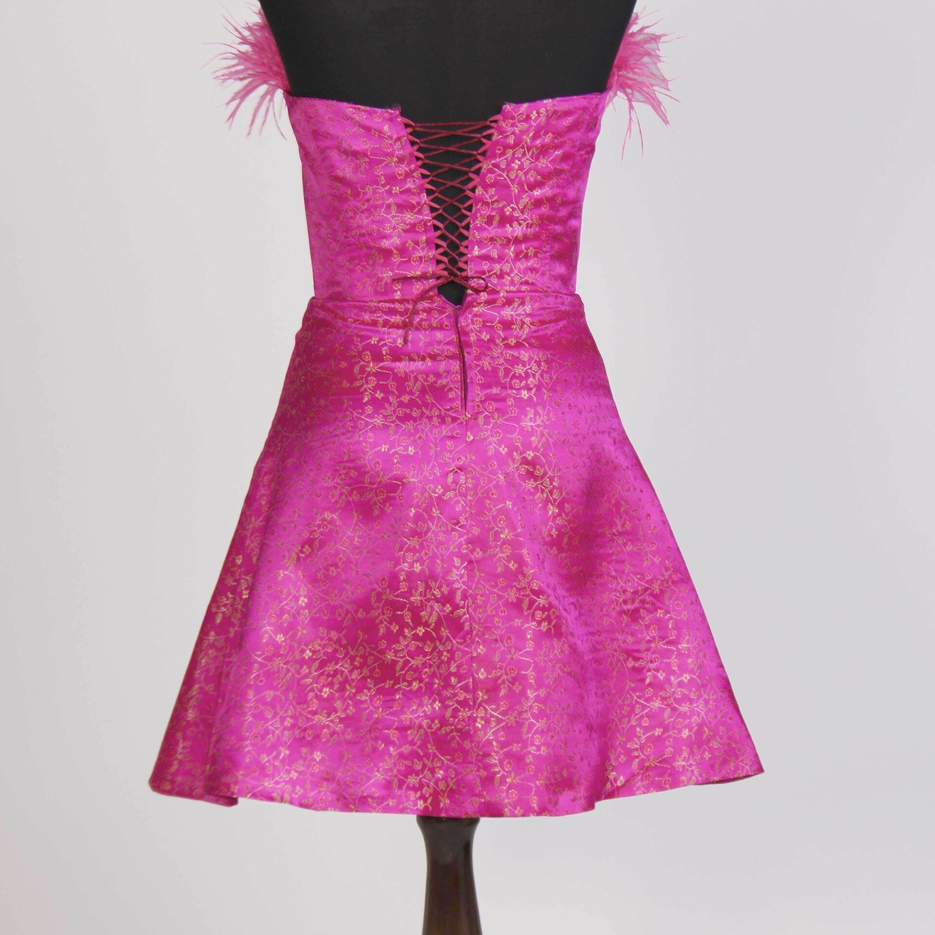 - پیراهن سرخابی از پارچه ساتن با پترن گل های ریز و طلایی