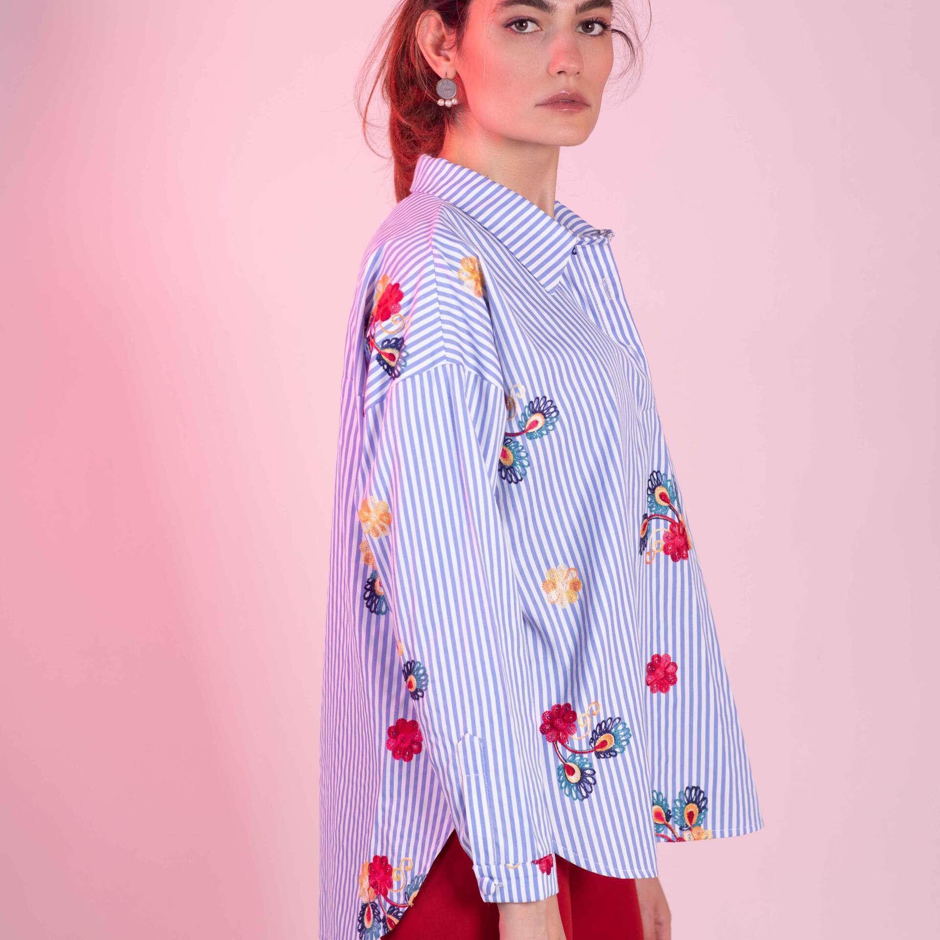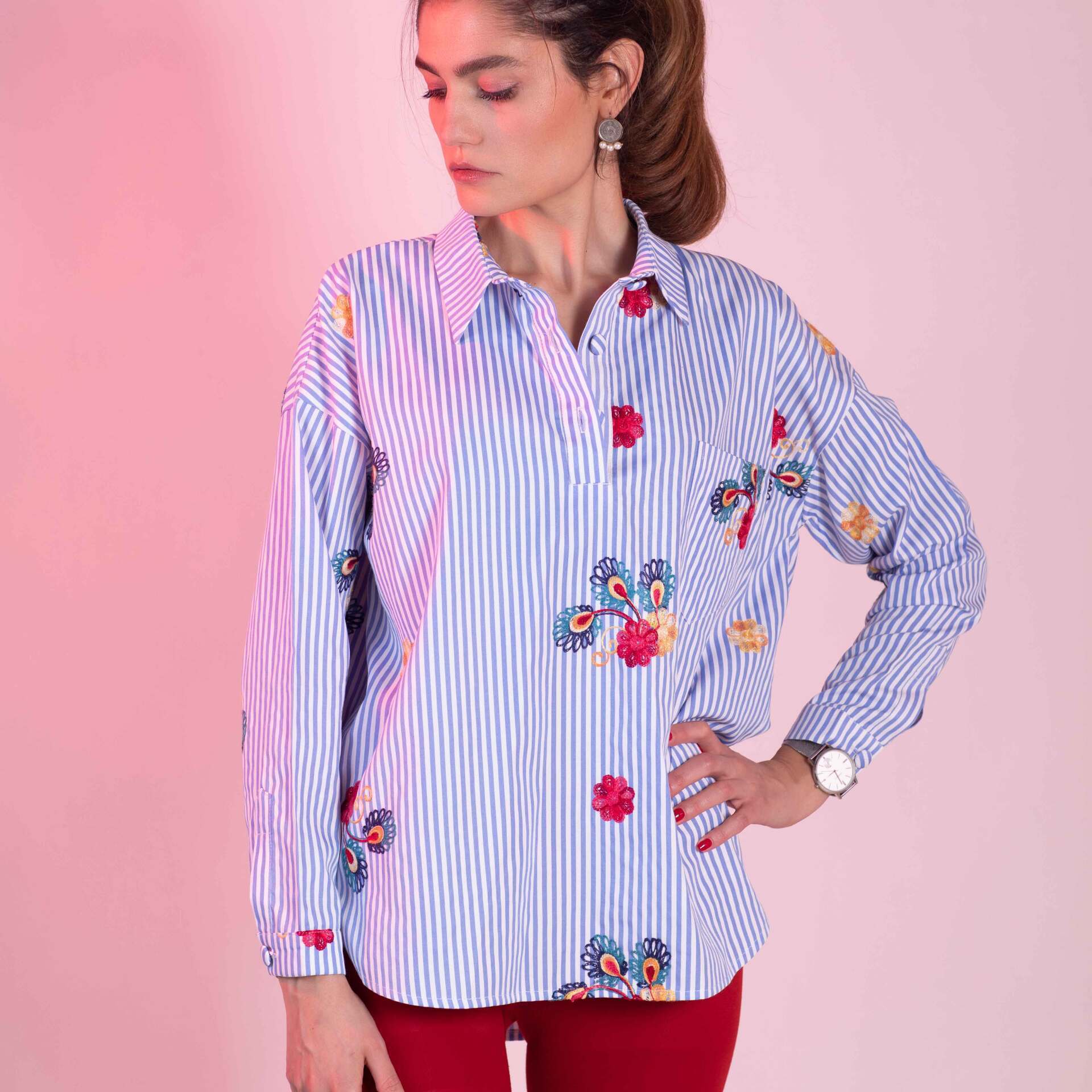 شومیز راه راه یقه مردانه خامه دوزی شده خنک و خاص